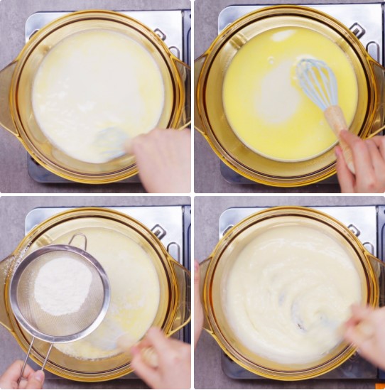 Bắc nồi lên bếp mở lửa vừa, cho vào nồi 30gr bơ lạt, 150ml sữa tươi, 20gr sữa bột, 30gr đường, bạn dùng phới đảo nhẹ nhàng. Tiếp đó rây vào nồi 30gr bột mì, chỉnh lửa nhỏ, dùng phới đảo nhẹ nhàng 3 – 4 phút cho tới khi bột sánh lại thì tắt bếp.